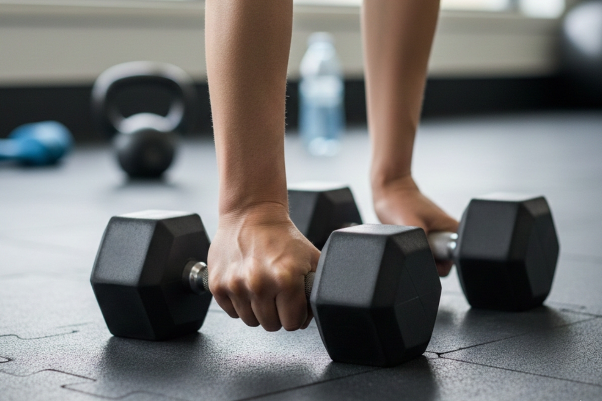 If “clawing the floor” isn’t enough, stop fighting anatomy and change the angle. By using dumbbells as a “handle,” you keep your wrists in a neutral, straight position. Think of holding a suitcase. This eliminates the 90-degree extension that causes most of the pinching sensation. It’s a total game-changer for push-ups, too!